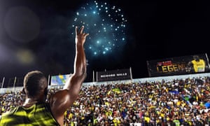 As Bolt crossed the line he was mobbed by cheerleaders and photographers as a bouquet of fireworks lit up the Kingston skyline. His lap of honour was long and delirious and he climbed into the stands to celebrate with friends and family before going back on the track to party with the Jamaican dancehall legend Beanie Man.